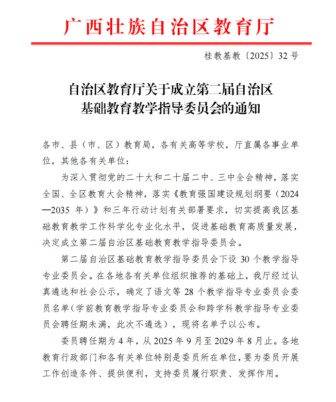 3位教师成功入选。其中,刘方富老师获聘第二届自治区基础教育教学指导委员会委员,同时担任历史教学指导专委会主任委员;覃淮宇、黎曦两位老师获聘为专门教育指导专委会委员。聘期为2025年9月至2029年8月。