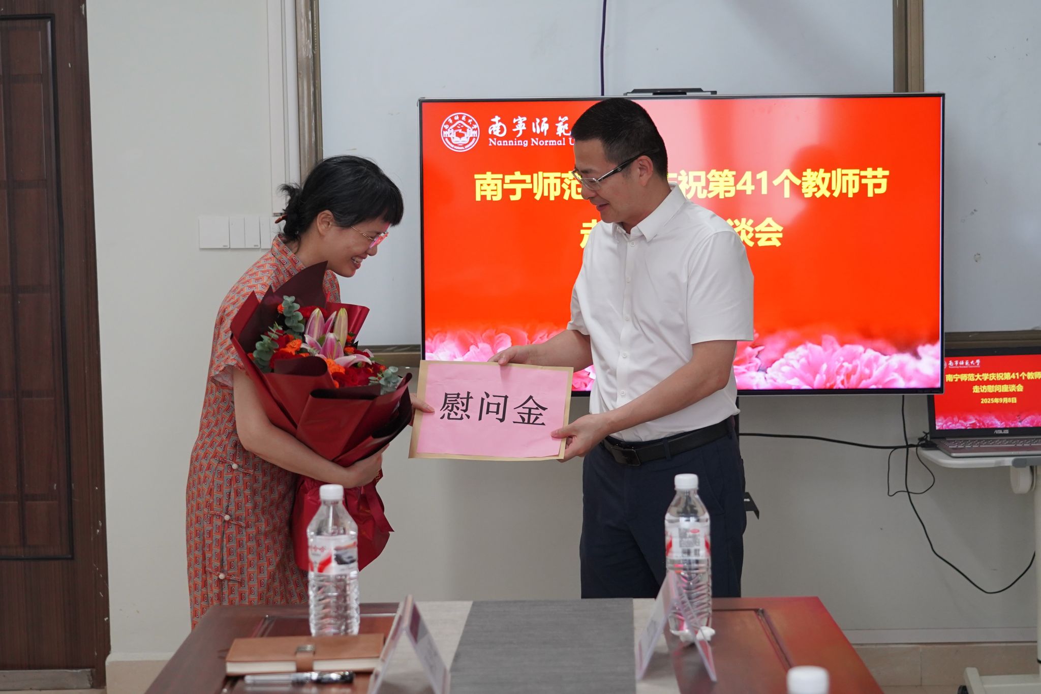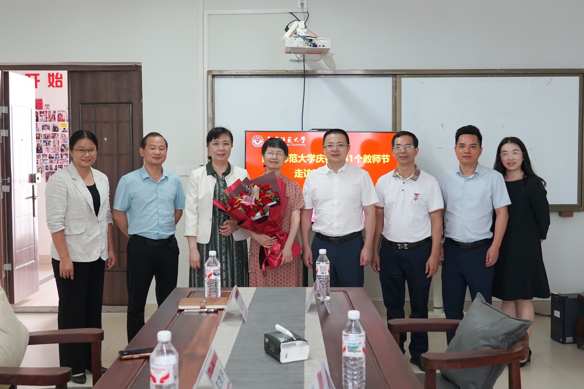亲切看望和慰问优秀教师代表覃淮宇老师,送上鲜花、慰问金并致以节日问候和美好祝福。学院党委书记许建、副院长吴少进(主持行政工作)、党委副书记张建梅一同参与慰问活动。