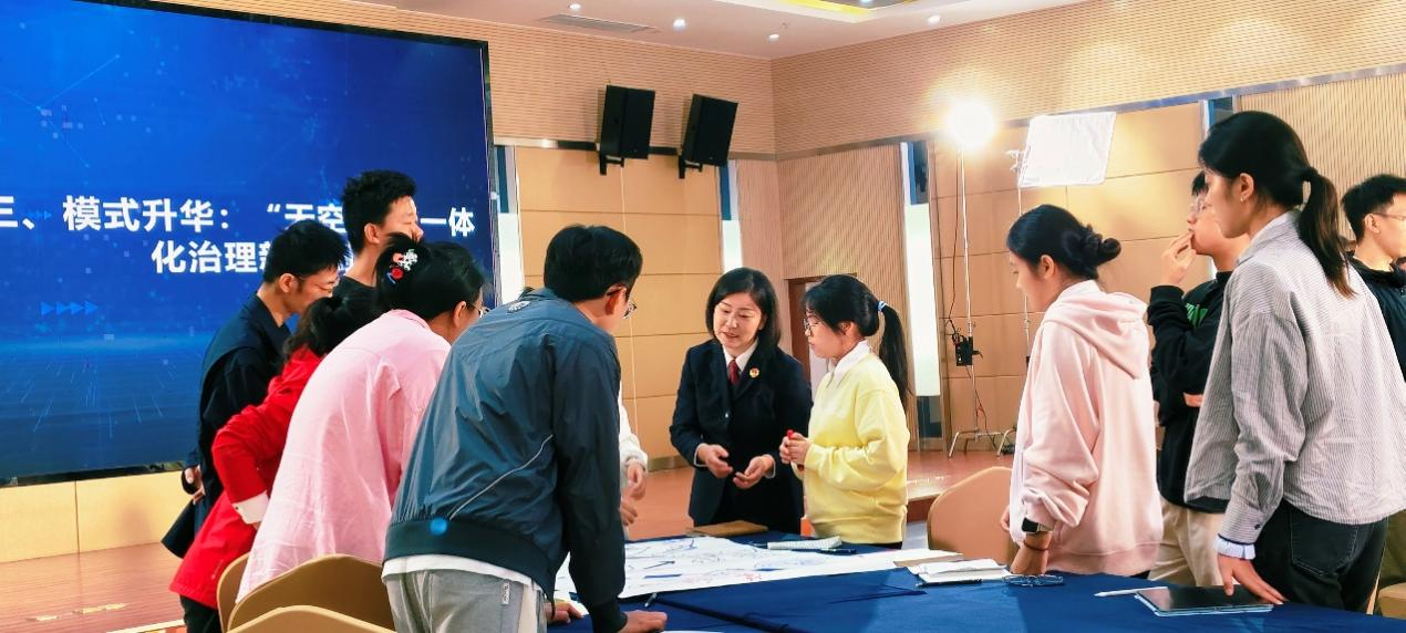 进入卫星遥感赋能司法工作模型构造环节,在何检察长的耐心引导下,学生们以分组讨论、绘画呈现的形式,共同构建卫星遥感赋能司法的工作模型。大家结合“天空地一体化”监测原理,在画纸上清晰勾勒出“天-空-地”三位一体的办案闭环。讨论中,学生们还进一步细化了模型中的关键节点,将抽象的技术原理转化为具象的实践框架,充分展现了理论联系实际的思考能力。