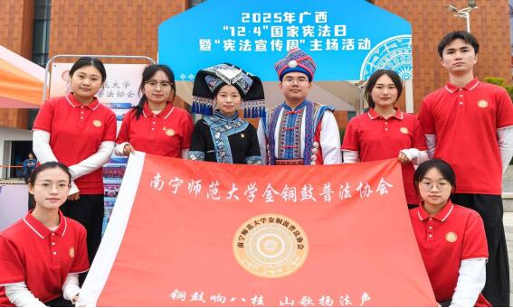12月4日上午,南宁师范大学金铜鼓普法协会受广西壮族自治区司法厅邀请,前往广西规划馆参加“平安中国2025——同心共筑 与法同行 走进广西南宁”主会场活动。作为本次活动主会场唯一受邀的高校代表,金铜鼓普法协会与自治区党委、自治区高级人民法院、自治区人民检察院、自治区司法厅等七个单位共同参与活动,协会以富有青春创意与文化底蕴的普法形式,展现了高校普法力量在法治社会建设中的独特价值。
