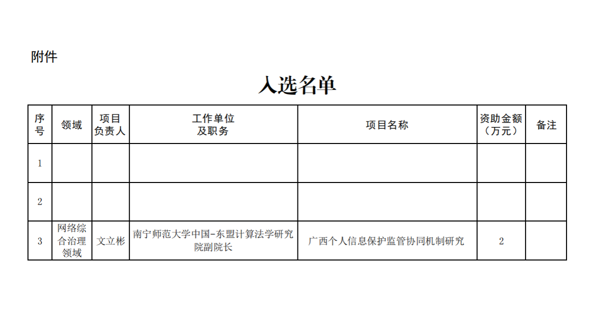 近日,自治区党委网信办公布了2025年度网信人才支持计划项目入选名单,由BB体育 法律系文立彬副教授主持申报的项目《广西个人信息保护监管协同机制研究》入选全区网络综合治理领域项目。