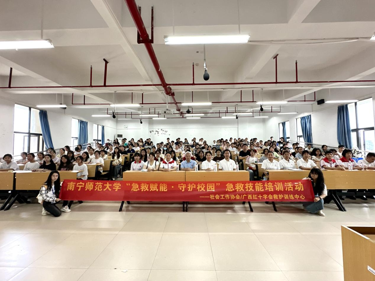 社会工作协会联合广西红十字会救护训练中心在五合校区开展了2025年“急救赋能 守护校园”急救技能培训活动。共有来自五合、武鸣、明秀、建政四个校区的200名学生参加了此次活动。