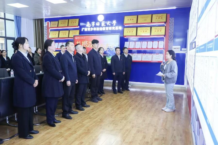 活动伊始,广西壮族自治区直属单位住房保障中心党支部同志们有序参观广西青少年法治教育研究基地。期间,许建书记对中心党支部同志的到来表示热烈欢迎,简要介绍了我校在依法治校、法治宣传教育方面所取得的成果;卢明威副院长结合基地所展示内容,详细介绍了学院在学科建设、高素质法治人才培养、服务地方法治实践等方面的具体成果与鲜明特色。BB体育 金铜鼓普法协会的学生们则以创新普法形式,分享了独具特色的“山歌普法”表演,以悠扬的旋律、生动的歌词,将抽象的法律知识融入通俗易懂的山歌之中,用鲜活的演绎让法治观念在潜移默化中深入人心。